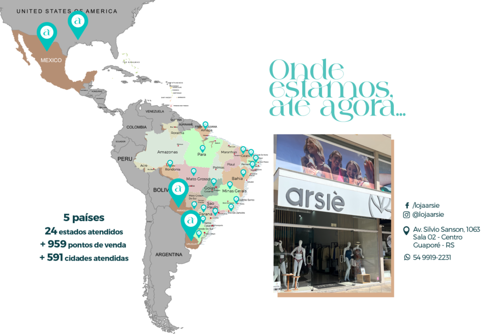Você encontra seu look Arsie em mais de 840 multimarcas por todo o Brasil — e também em nossa loja própria, em Guaporé – RS, com atendimento personalizado via WhatsApp e entrega para todo o país.